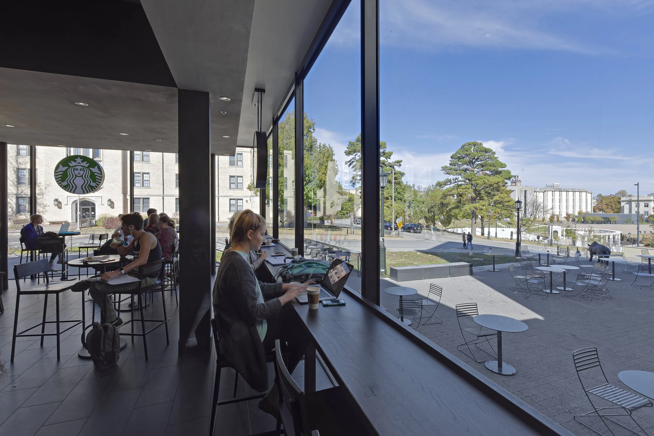 The location of an overcrowded and undersized Starbucks became the impetus for the design of an expansion that captures space from an adjacent busy plaza. The existing coffee shop located in the corner of Brough Commons – a low 1950’s era dining facility on the University of Arkansas’ Fayetteville Campus – was dingy, low ceilinged, crowded, without adequate queuing area, and in need of remodel and expansion.